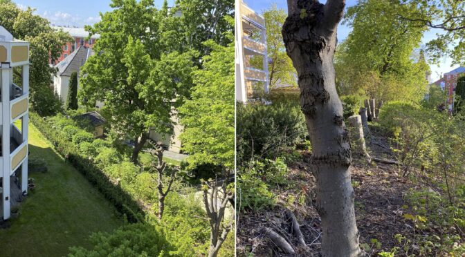 Fem friske lindetrær, med en antatt alder på 45 år er kappet i en høyde på 1-2 meter. Styret hevder at de ikke har felt trærne, men «beskåret» dem. Fagfolk som Treets venner har kontaktet er temmelig samstemte om at denne beskjæringen er utført på en måte som tar livet av trærne, eller så skyter de skudd og blir til et «kosteskaft». Disse trærne kommer aldri til å bli «trær» igjen.